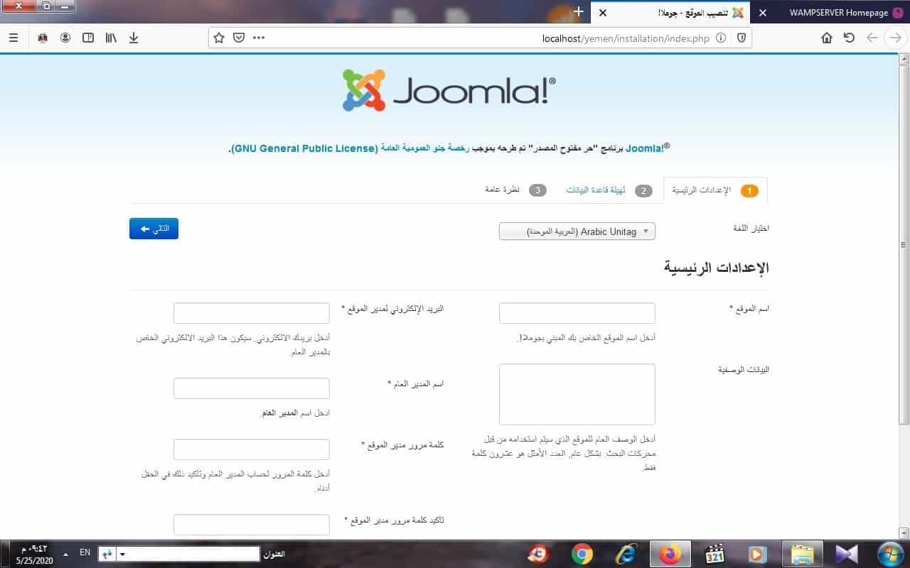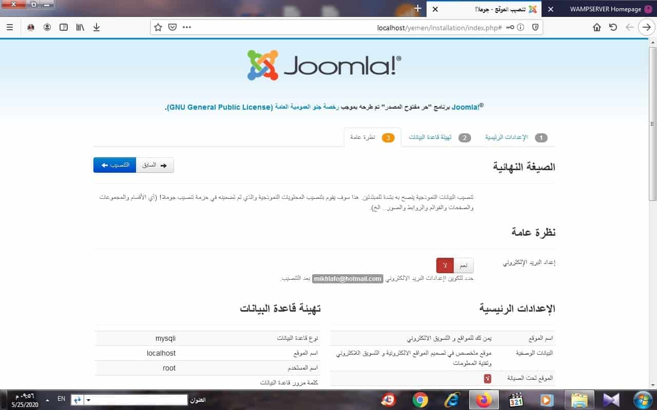 سيفتح لك نافذة الاعدادات الرئيسية لنظام جوملا تطلب منك ادخال جميع البيانات الهامة و الخاصة بموقعك الالكتروني مثل اسم الموقع والبيانات الوصفية للموقع والبريد الالكتروني لمدير الموقع و اسم مستخدم مدير الموقع وكذلك كلمة مرور المستخدم لمدير الموقع يفضل كتابتها في ورقة او ملف نصي حتى لا يتم نسيانها كما هو موضح في الشكل التالي