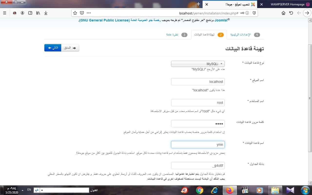 بعد الانتهاء من ادخال جميع بيانات الاعدادات الرئيسية للموقع والضغط على زر التالي تفتح لك نافذة تهيئة قاعدة البيانات وربطها بالموقع حتى يتم نسخ جداول قاعدة بيانات نظام جوملا الى قاعدة البيانات الجديدة والتي تم انشائها سابقا عبر برنامج السيرفر المحلي (localhost) وهنا تظهر لك النافذة كما هو مبين في الشكل تطلب منك بيانات قاعدة البيانات على السيرفر المحلي (localhost) كما هو موضح في الشكل التالي