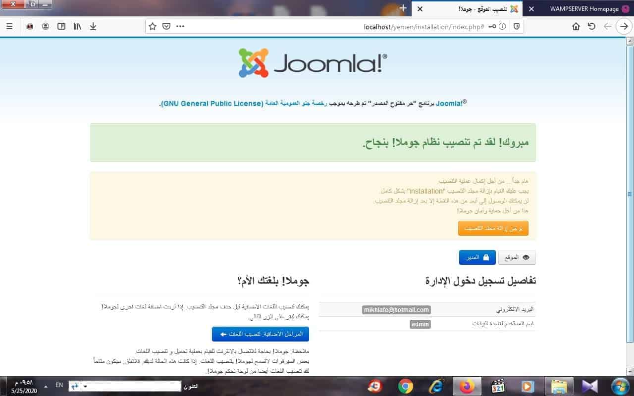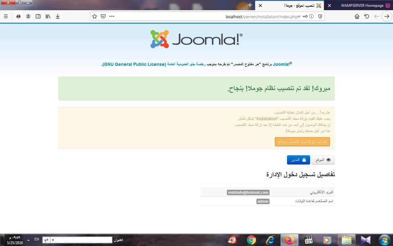 وبعد الحذف لمجلد التحميل تظهر لك ايقونة تعلمك بانه تم حذف او ازالة مجلد التنصيب بنجاح ويمكنك بعدها استعراض الموقع او الدخول على ادارة الموقع او لوحة تحكم الموقع كما هو مبين في الشكل التالي
