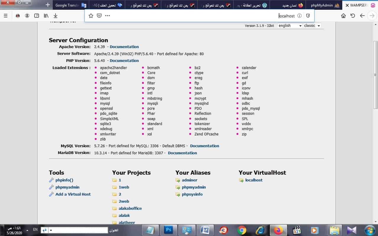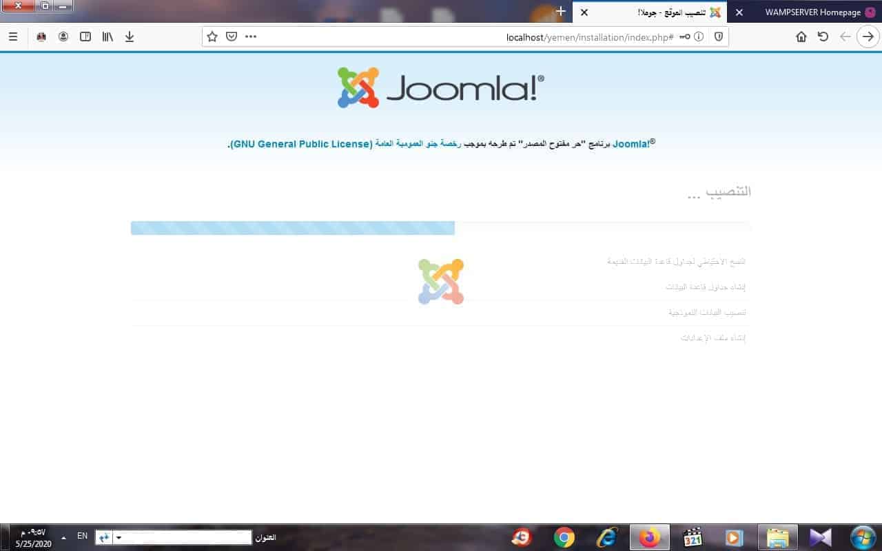 بعد تركيب السيرفر المحلي على جهاز الكمبيوتر الخاص بك وانشاء قاعدة البيانات الخاصة بالموقع الالكتروني المراد تصميمة نقوم بتركيب احدى انظمة ادارة المحتوى لتصميم المواقع الالكترونية وهنا وفي هذا الدرس سنتعلم على تركيب نظام ادارة محتوى جوملا (joomla) فهو من افضل الانضمة واكثرها شهرة ويوجد على الانترنت الملايين من المواقع المصممه بهذا التظام او البرنامج ولنبد من تركيب نسخة سريعة التركيب لنظام جوملا ( ) فعند نسخ ملفات الموقع المضغوطة ولصقها في مجلد السيرفر المحلي للوامب (C:\wamp\www) بعدها نقوم بفتح المتصفح والدخول على (localhost) وكتابة اسم المجلد على شريط المتصفح با الطريقة (الصحيحة) او يمكنك الضغط عليه من قائمة السيرفر المحلي بند (your projects) كما هو مبين في الشكل التالي