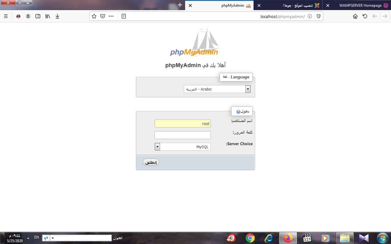 ( wampserver – apache server – xampp server) وغيرها وبعد تحميل احدى هذه البرامج على جهاز الكمبيوتر وعمله بالشكل الصحيح يجب عليك اولا الدخول الى البرنامج باستخدام اسم المستخدم وكلمة المرور التي عملتها اثناء تحميلك لبرنامج السيرفر (localhost) كما بامكانك تحميل برنامج السيرفر بدون كلمة مرور وعادة ما يكون اسم المستخدم الافتراضي (root) وعند الدخول للبرنامج يتم انشاء قاعدة البيانات ليتم ربطها ببرنامج ونظام جوملا والشكل التالي يوضح ذلك على السيرفر المحلي وامب سيرفر (wampserver)
